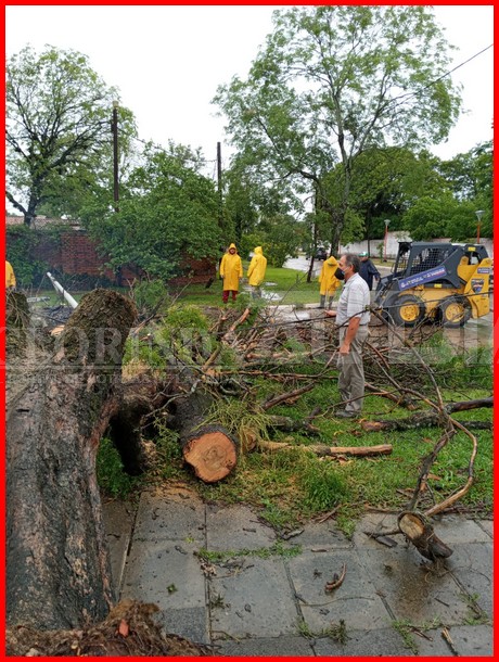 La copiosa lluvia de la jornada de miércoles vino acompañada de algunas ráfagas de viento que generaron daños y caídas de algunos árboles, como el que se encontraba detrás del edificio de Aduana sobre calle San Lorenzo, allí los equipos municipales pertinentes estuvieron trabajando para liberar la arteria y principalmente llevar tranquilidad en cuanto a la columna de iluminación dañada para sacarla de circulación y que no implique un peligro para quienes circulan por esa zona.