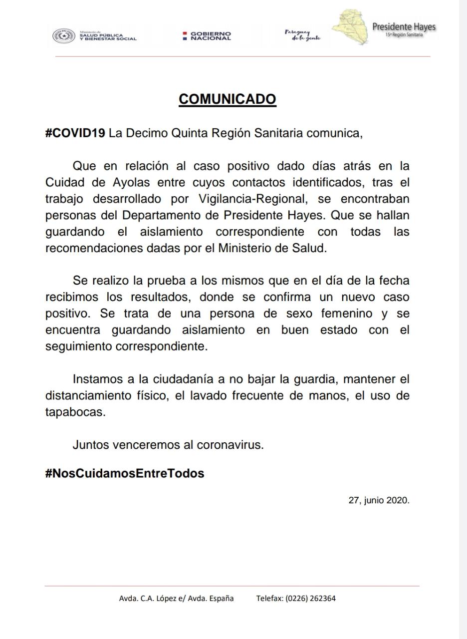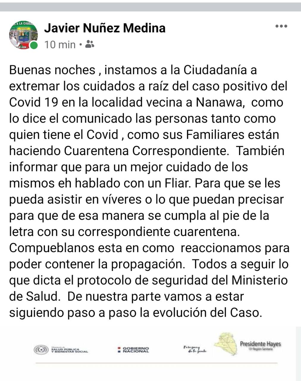 En la noche del sábado se confirmó mediante un comunicado oficial de la décimo quinta región sanitaria, la existencia de un caso positivo en aquella familia que días atrás había viajado a Ayolas junto a uno de sus miembros que es militar y que posteriormente se supo por los medios de comunicación sobre su caso positivo de coronavirus. La familia de BetereteCué se encuentra aislada desde el momento en que se tomó conocimiento de la posibilidad de contagio y más aun con esta confirmación, el propio Intendente de Nanawa Javier Núñez confirmo la noticia y llevo tranquilidad a todos pero al mismo tiempo solicitó una mayor precaución e insto a la ciudadanía de la vecina localidad a que cuiden los detalles de seguridad sanitaria, distanciamiento y uso de barbijo, al mismo tiempo en que garantizo la asistencia a la familia para que estos días de cuarentena sean lo más llevadero posibles.La preocupación de los clorindenses por este caso positivo en la vecina orilla es entendible teniendo en cuenta que la frontera es sumamente permeable y que existe un intercambio constante pese a existir el cierre de fronteras ya que los controles no son los ideales.
