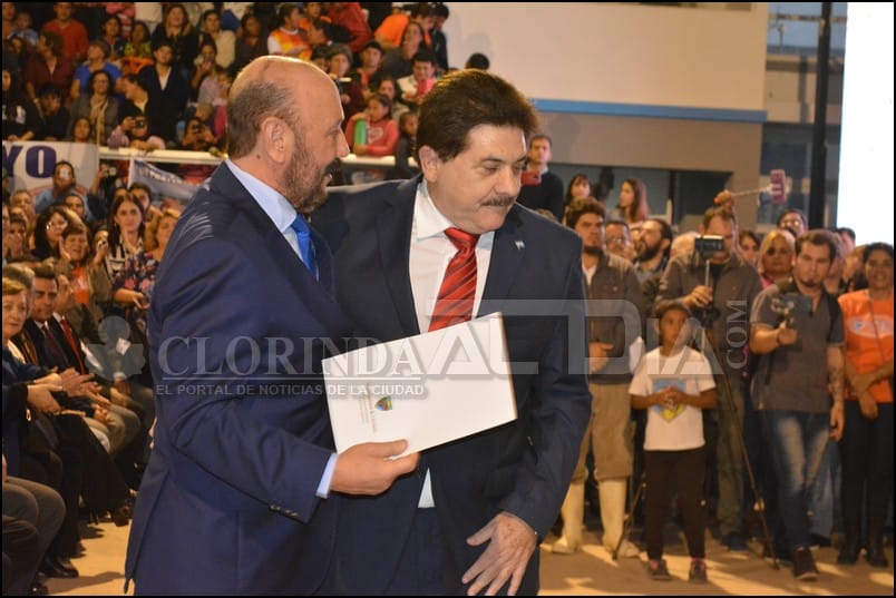 Posteriormente toda la comitiva provincial y comunal se trasladó hasta la sede del Argentinos del Norte donde se realizó el acto de entrega de 48 viviendas del barrio Pedro Euclides Insfrán, acto que estuvo a cargo del Dr. Gildo Insfrán, el Intendente Manuel Celauro, el Senador Nacional José Mayans, el Diputado provincial y candidato a Vicegobernador Eber Solís y otros funcionarios del gabinete provincial. Unas colmadas instalaciones hicieron que todo esto sea una verdadera fiesta en la que hicieron uso de la palabra una beneficiaria quien agradeció la entrega de estas viviendas y que le permiten a tantas familias contar con un techo digno, por otra parte hablo también el Intendente Celauro que entre otras cosas hizo un repaso de todas las obras ejecutadas con apoyo provincial y otras que se encaran con recursos genuinos, además hizo un especial foco sobre las políticas implementadas por el gobierno nacional que lamentablemente a diferencia de las obras que encara la provincia no las concluyen, se paralizan y en algunos casos ni siquiera se inician, poniendo como un claro ejemplo la planta de agua potable. Finalmente dejo bien en claro que como ocurriera años atrás está el compromiso de la ciudadanía clorindense de ayudar con sus votos a la continuidad del proyecto de provincia en clara muestra d agradecimiento por todos los beneficios y los cambios que se dieron en este tiempo.
