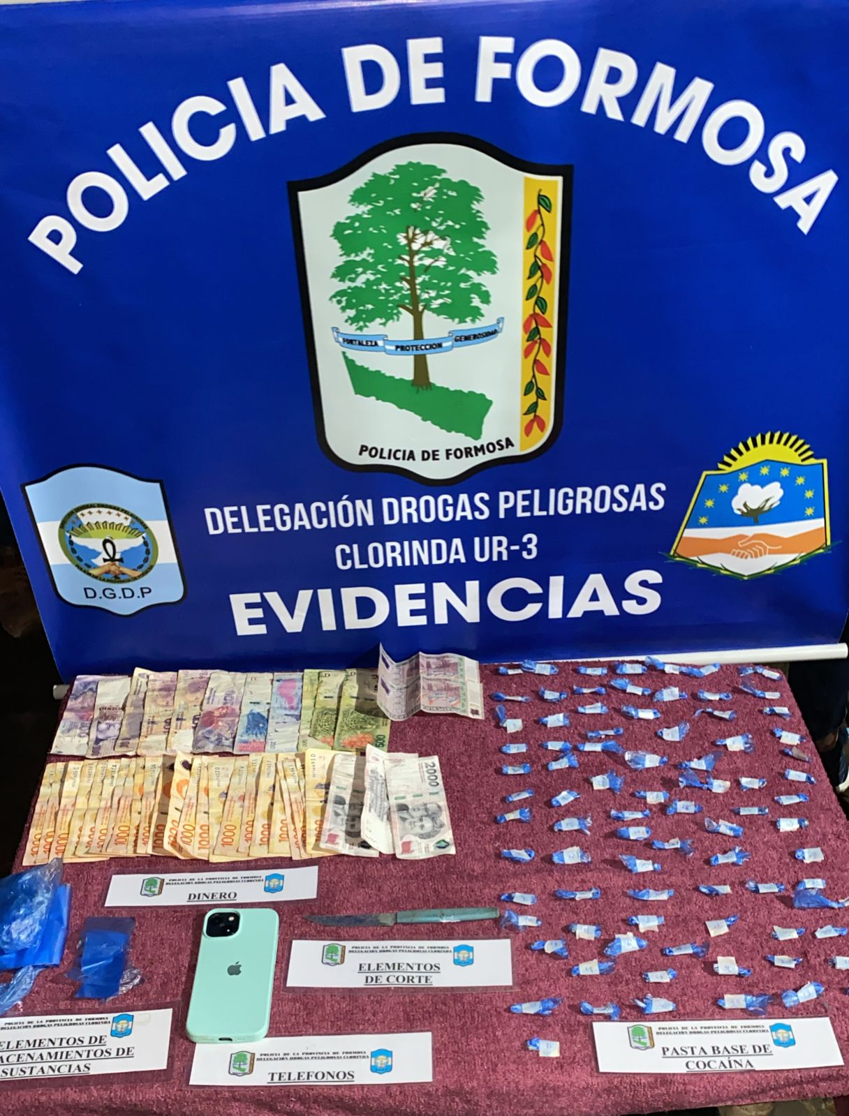 La Medida Judicial fue concretada en la tarde de este Miércoles 22 de Abril con colaboración del personal de DDR (Destacamento de Desplazamiento Rápido) con asiento en la segunda ciudad, obteniendo como resultado el secuestro de dinero en efectivo, elementos de almacenamiento de sustancias, arma blanca, teléfonos celulares, más de 80) dosis de Pasta Base de Cocaína fraccionadas listas para su comercialización, entre otros elementos de interés para la causa, la detención de una persona de sexo femenino y la retención de un menor causante sindicados como responsables de la actividad ilícita.