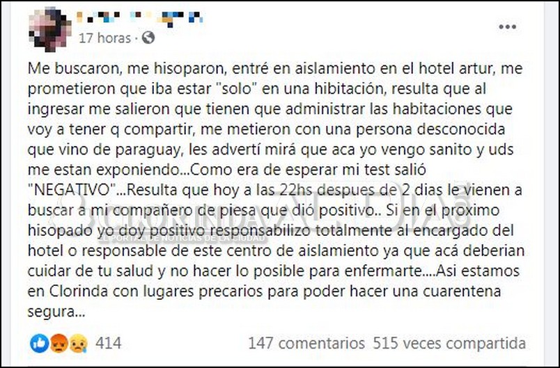 En una habitación reducida sin contar con los elementos de limpieza y desinfección fueron puestos en cuarentena, el clorindense que se comunicó a través de las redes informó que él debió llevar todos los elementos de seguridad sanitaria y que desde el primer momento estuvo en desacuerdo en compartir la habitación con otra persona a la cual desconocía su situación. Entre otras cosas manifestó además que él ingreso sano, su primer hisopado le dio negativo y si algo contrae en estos días seria culpa o responsabilidad de quienes se encargan del alojamiento de personas en el hotel ubicado sobre avenida España.