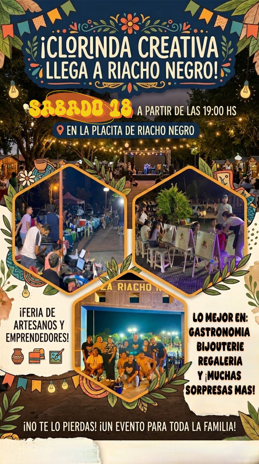 Clorinda Creativa con su versión itinerante ya prepara su visita al barrio Riacho Negro, será este sábado desde las 19 hs. En la placita del barrio, así lo confirmo Rolando “Pipe” Ojeda desde la Dirección de Juventud y Cultura. Hay mucho entusiasmo en la preparación previa de esta feria que ya como en años anteriores, fue visitando distintos barrios, permitiendo que emprendedores del sector puedan tener la oportunidad de sumarse y ofertar lo que tengan, y a ellos se anexan algunas cositas que se acompañan con otros emprendedores del resto de Clorinda.