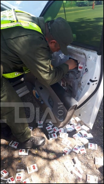 DEL CONTROL EFECTUADO EN EL INTERIOR DEL AUTOMOVIL SE PUDO DETECTAR OCULTO EN VARIOS SECTORES DEL VEHICULO, ESPECIALMENTE DETRÁS DE LOS PANELES DE LAS PUERTAS, ACONDICIONADOS UNA GRAN CANTIDAD DE PAQUETES DE CIGARRILLOS DE INDUSTRIA Y PROCEDENCIA EXTRANJERA, LOS OCUPANTES DEL AUTO NO PUDIERON JUSTIFICAR EL EL TRANSPORTE DE LOS MISMOS.