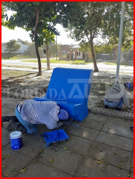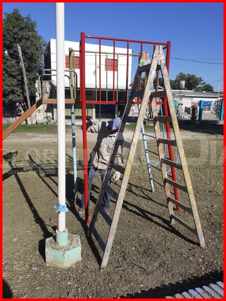 Allí el personal a cargo del señor Raúl Pedroso se encuentra ejecutando tareas ligadas a mantener los elementos que son utilizados de forma frecuente por los chicos del barrio, entre las tareas se encuentran la pintura de los juegos, bancos y columnas de iluminación pero también mediante el acompañamiento de otras áreas de Obras Publicas se realiza la recuperación de algunos juegos que están dañados, para eso se necesita el acompañamiento del personal de herrería del taller lo cual ayuda a solucionar de forma rápida los inconvenientes de ciertos juegos y dejarlos nuevamente listos para su uso.