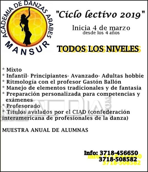 De manera silenciosa vienen trabajando desde la Academia de Danzas Arabes Manzur, es una escuela de danzas que se encuentran trabajando con este arte desde hace tiempo en la ciudad de Clorinda pero tal vez sin tanta difusión pero si con muchos logros que se dan principalmente en localidades, provincias vecinas o incluso en la vecina república del Paraguay, pero este año 2019 se inicia con muchos proyectos nuevos y con energías totalmente recargadas, es por ello que nos comentaban María José Inojosa quien es Directora de la escuela y Mariela Galarza quien es profesora que están ya desde el pasado lunes con las clases para este año y que siguen las inscripciones abiertas para todas las edades, desde los cuatro años ya pueden acercarse y no hay límite de edad, tampoco existen condicionantes más que tener ganas de aprender, no es necesario conocer lo básico de este ritmo ya que las clases se van dando y acomodando con cada alumno/a.