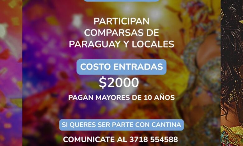 Desde la comisión de corsos informaron además que están abiertas las inscripciones para aquellos que deseen instalar cantinas con un costo de $100.000, los interesados pueden comunicarse al 3718 554588. En cuanto al valor de las entradas, tendrá un costo de $2000, menores de 10 años no abonan.
