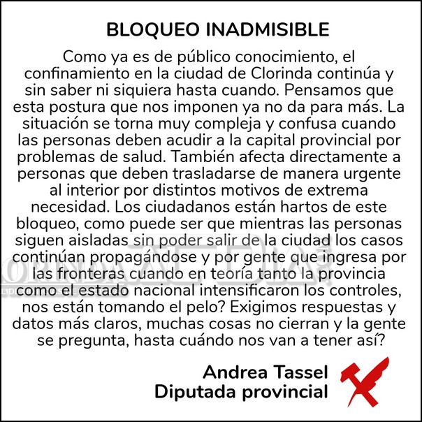 Por medio de un breve comunicado la Diputada Provincial Andrea Tassel hizo conocer su posición luego de conocida l continuidad de lo que es el bloqueo de Clorinda, cuestión que genera contratiempos en ciertas personas que deben realizar actividades fuera de la ciudad, la nota de Tassel señala cuanto sigue: