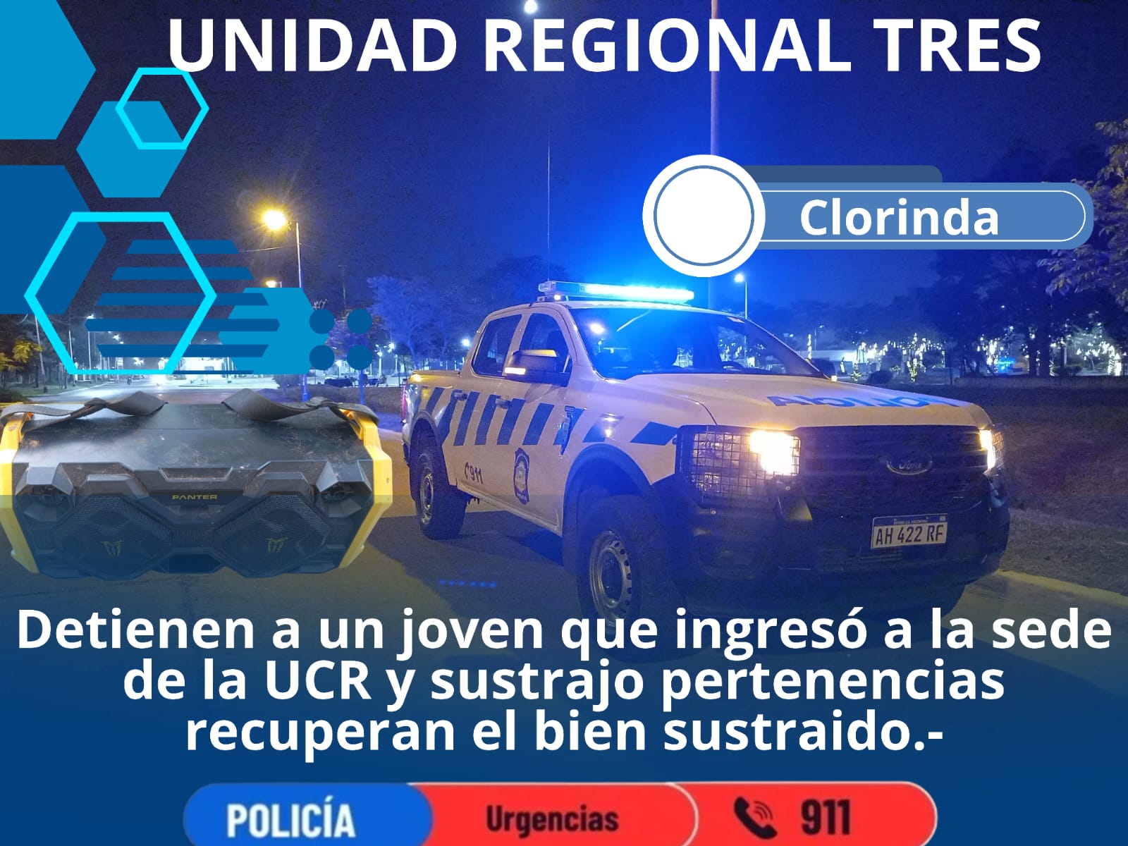En horas de la siesta del medio día del domingo, efectivos policiales dela Brigada de Investigaciones y de la Zona 2 del CPSU, en calle Alberdi y José Fernández Cancio, procedieron a la aprehensión del presunto autor del hecho un joven de 22 años con frondosos antecedentes por delitos contra la propiedad lográndose además al secuestro de un parlante de tamaño grande de color negro con detalles amarillos.