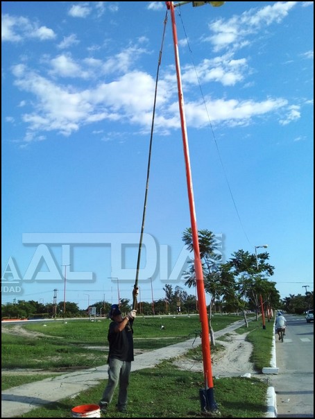 Uno de los responsables de los trabajos comentaba que existen dos equipos, por una parte unos que se encargan de la parte más baja hasta donde pueden hacerlo con los elementos desde el suelo mientras que existe otro equipo que utiliza ya sea las grúas de las áreas de mantenimiento eléctrico o bien utilizando el carro hidráulico elevador con el que pueden llegar a completar el trabajo necesario. Las tareas actualmente son encaradas en la zona de colectoras desde avenida España hacia el sur en los dos sentidos pero estarían avanzando hacia el resto de los sectores.