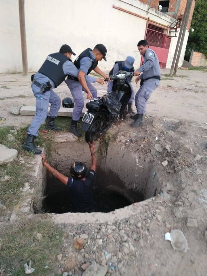 En la tarde del sábado se produjo un hecho bastante llamativo, un motociclista que circulaba en la zona de las avenidas Roque Sáenz Peña y España intento evitar el control policial y termino cayendo a un conducto de desagüe pluvial que se encontraba sin la tapa correspondiente. Según los datos obtenidos el hombre mayor de edad circulaba a bordo de una moto de 110 cc. Color negra y al llegar a la mencionada intersección se encontró con los efectivos policiales que están apostados realizando la verificación de personas de forma preventiva ante esta situación del COVID-19, este conductor a fin de intentar evitar dicho control realizó una maniobra para intentar subir a la zona de vereda de un comercio pero no se percató que allí se encontraba sin ningún tipo de protección el conducto de desagüe de toda esa zona, eso género que el motociclista cayera al pozo y quedara atrapado con la moto encima suyo.