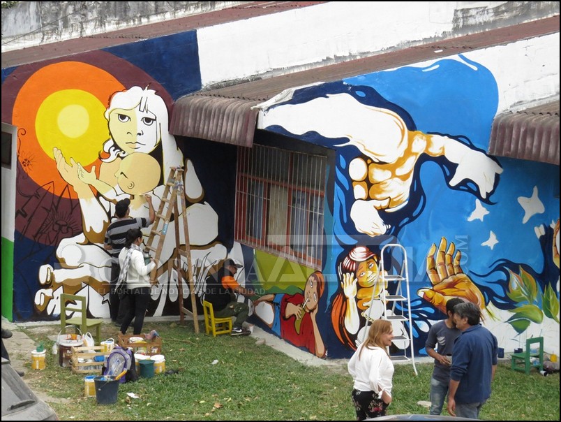 El equipo estuvo trabajando en el jardín Maternal “Nuestra Señora de los Ángeles”, edificio ubicado en las 742 viviendas(al lado de la capilla Inmaculado Concepción de María) del barrio del IPV, la temática del trabajo es la labor de la mujer con la crianza de los chicos que se ve reflejado en el mural.