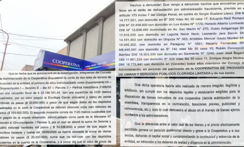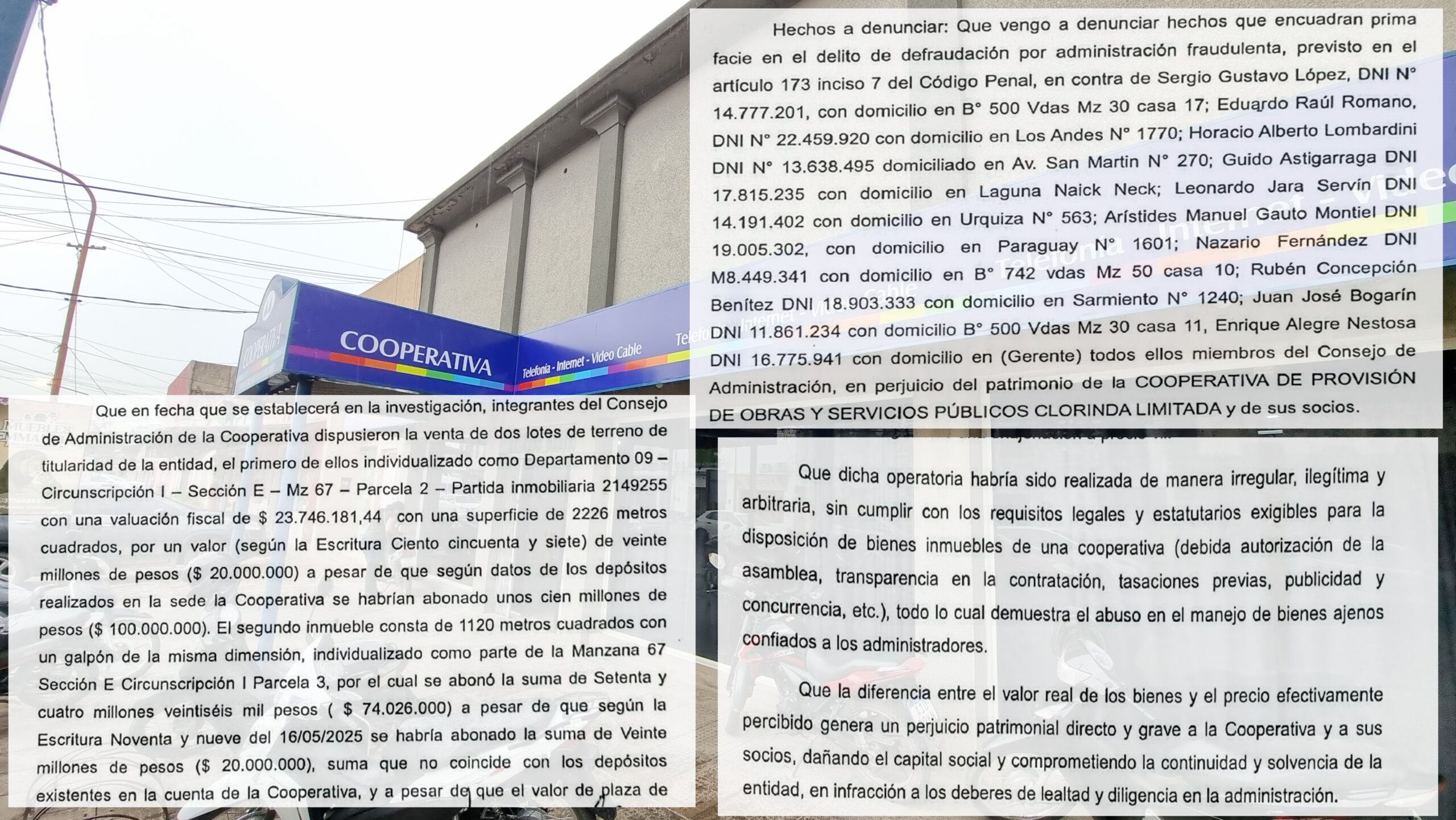Se pudo saber que recientemente habría ingresado una nueva denuncia penal ligada a quienes ocuparon cargos dentro de la anterior administración de la Cooperativa de Provisión de Obras y Servicios Públicos Clorinda Limitada, la denuncia estaría ligada directamente a la venta de dos terrenos que pertenecían a la cooperativa y que las cuentas, los detalles y las documentaciones como así también las formas no habrían sido claras o transparentes.