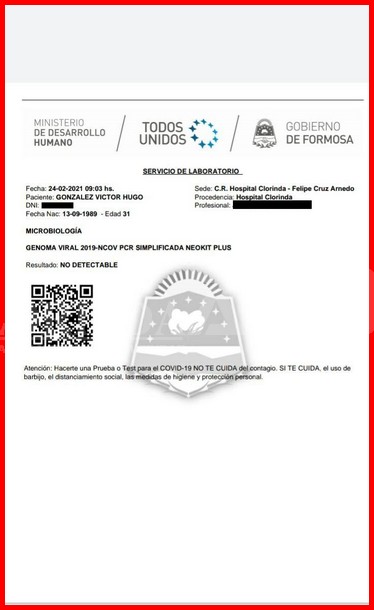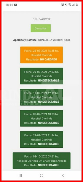 Verificando las paginas oficiales donde se informan de los resultados se puede observar como a este hombre los resultados marcan como que es negativo a coronavirus, y lo más grave que denuncia la mujer es que quienes están en contacto con su pareja le manifestaron que le volverían a hacer otro hisopado durante el jueves y no se lo hicieron, pero en la página oficial figura que si, además de que le manifestaron que se quedara tranquilo que el otro testeo le daría positivo.