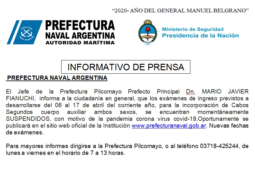 El Jefe de la Prefectura Pilcomayo Prefecto Principal Dn. MARIO JAVIER FIANUCHI, informa a la ciudadanía en general, que los exámenes de ingreso previstos a desarrollarse del 06 al 17 de abril del corriente año, para la incorporación de Cabos Segundos cuerpo auxiliar ambos sexos, se encuentran momentáneamente SUSPENDIDOS