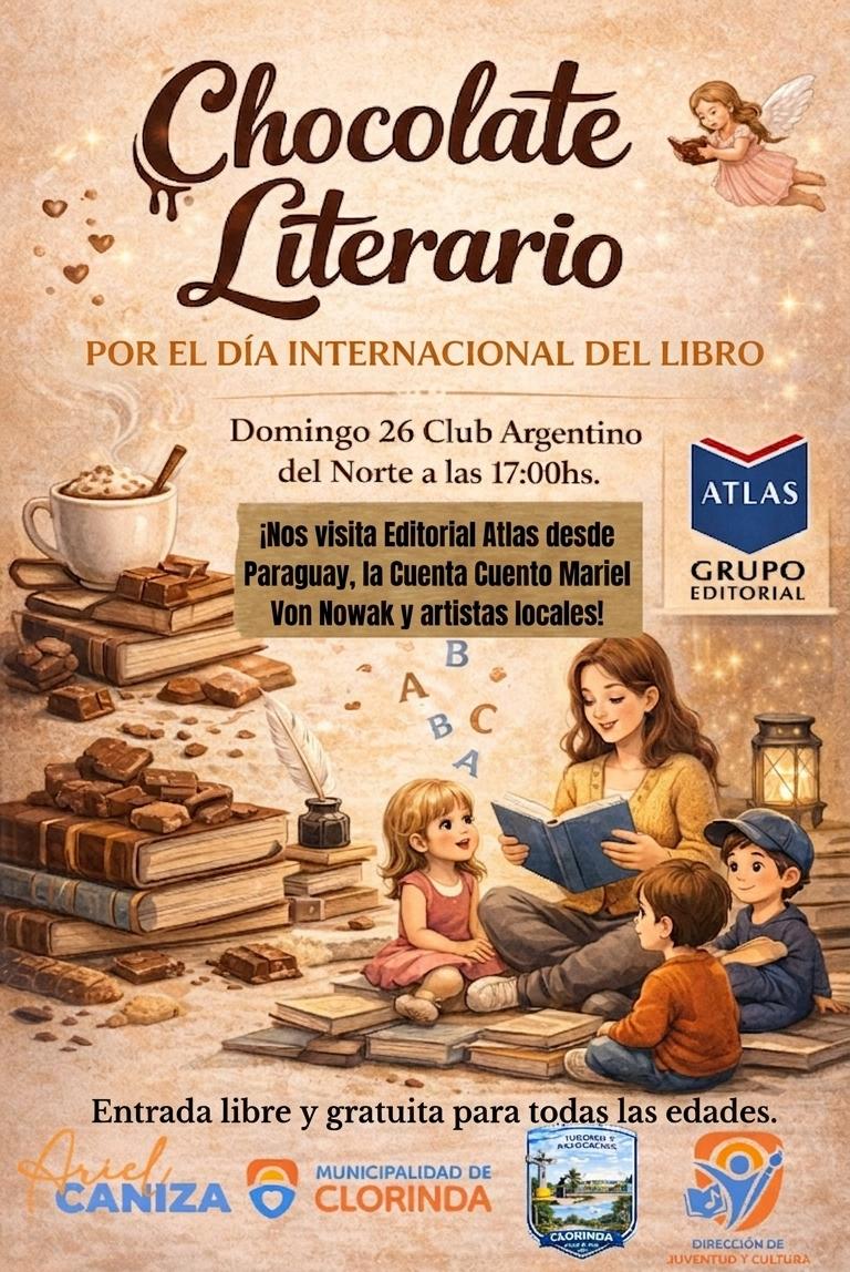 Desde las Direcciones de Juventud y Cultura, y la Dirección de Turismo invitamos a los vecinos de Clorinda el Domingo 26 a las 16:30 horas al “Chocolate Literario” en el salón del Club Argentinos del Norte, sito “Moreno c/ 12 de Octubre”, esta actividad va dirigida a niños y jóvenes.