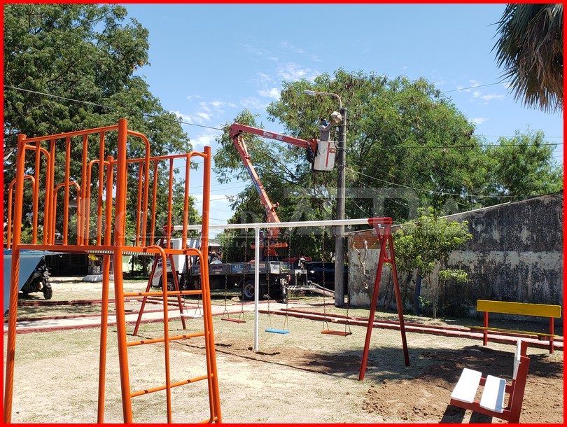 Espacios Verdes, Higiene Urbana y Mantenimiento Eléctrico trabajaron de forma conjunta para completar lo necesario, por el lado de Higiene Urbana encaran la pintura de los diferentes elementos tales como juegos y equipos de gimnasia, en tanto Mantenimiento Eléctrico estuvo realizando el cambio de luminarias ya que como se sabe se está trabajando actualmente en la modernización de la lumínica de la plaza San Martín y esos elementos son reciclados y utilizados para mejorar estos lugares. En tanto que Espacios Verdes se encargó del relleno de sectores puntuales que requerían de la utilización de suelo tipo arena gorda donde se encuentran algunos juegos, el trabajo conjunto hace que la tarea general sea eficaz y pueda cumplirse con todas las necesidades de espacios como este.