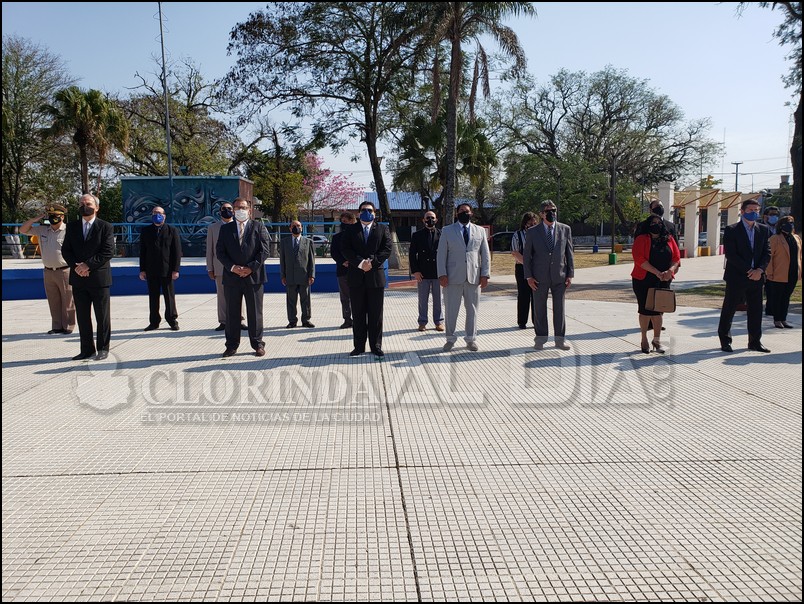 Este 29 de septiembre día de Clorinda, en su 121° aniversario todo se dio de forma diferente como lo que viene sucediendo a lo largo de este año, el acto por este nuevo aniversario se desarrolló en la plaza San Martín y estuvo encabezado por el Intendente Manuel Celauro y el Presidente del Honorable Concejo Deliberante Ariel Caniza, mas funcionarios del estado provincial, municipal, de fuerzas de seguridad y autoridades consulares de la vecina república del Paraguay. Con el izamiento de las Banderas Nacional y provincial, más la entonación de los himnos se estuvo iniciando dicha ceremonia en la que a diferencia de años anteriores le faltaba ese colorido que le dan las banderas de las diferentes instituciones educativas, de las fuerzas de seguridad y OGN´s que suelen participar pero por esta cuestión de pandemia lamentablemente no se puede dar.