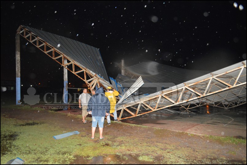 Múltiples daños generó el fuerte temporal que se desató sobre la ciudad de Clorinda en la noche del sábado, si bien existía un alerta meteorológica tampoco se esperaban que los vientos fueran tan severos como se terminó dando ya que producto de eso se registraron voladuras de techos, caídas de árboles y postes de diferentes servicios y lo más significativo sin dudas fue la caída del techo del playón deportivo del barrio de las 300 viviendas. Minutos después de las 21 hs. se iniciaron los fuertes vientos que comenzaron a dejar las secuelas, seguidamente se desato un fuerte lluvia y más vientos con alguna caída de granizos, ya cerca de las 22 la lluvia perdió intensidad l igual que los fuertes vientos y se pudo salir a hacer un trabajo de verificación de los daños que pudo haber generado dejando sin dudas como principal inconveniente lo señalado en cuanto al tinglado del playón de las 300 viviendas que literalmente resulto doblado en medio tal como sucediera semanas atrás en otras localidades.